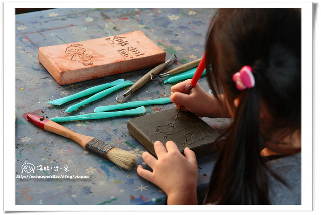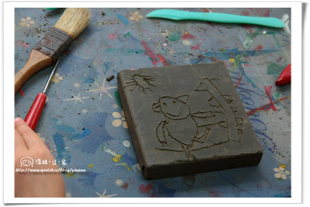 就這樣,小妮子她煞有其事地拿起雕刻工具再生坯上畫了起來!~