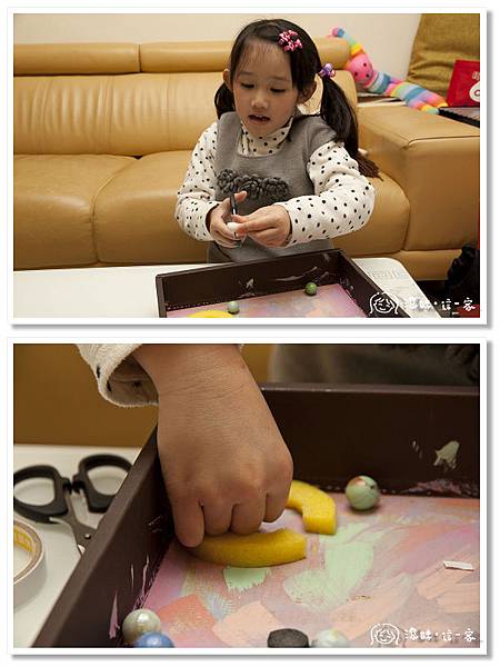 餅盒也是常常被利用的材料之一,繼上次用餅盒的蓋子做了彈珠迷宮後,